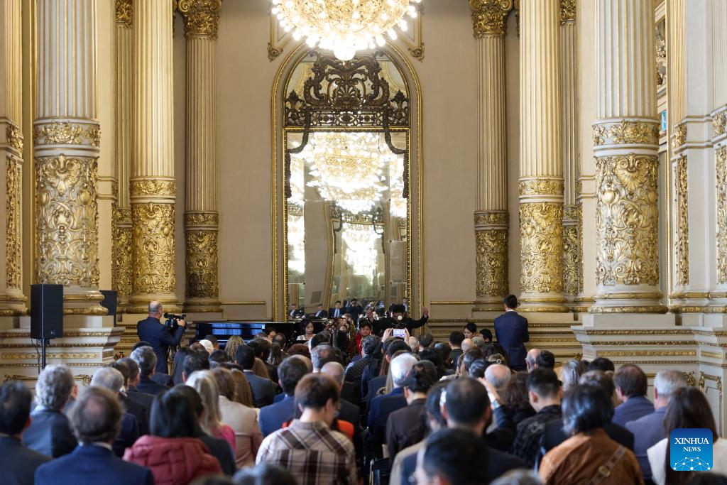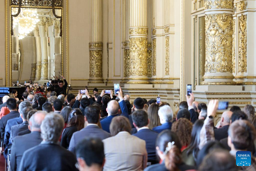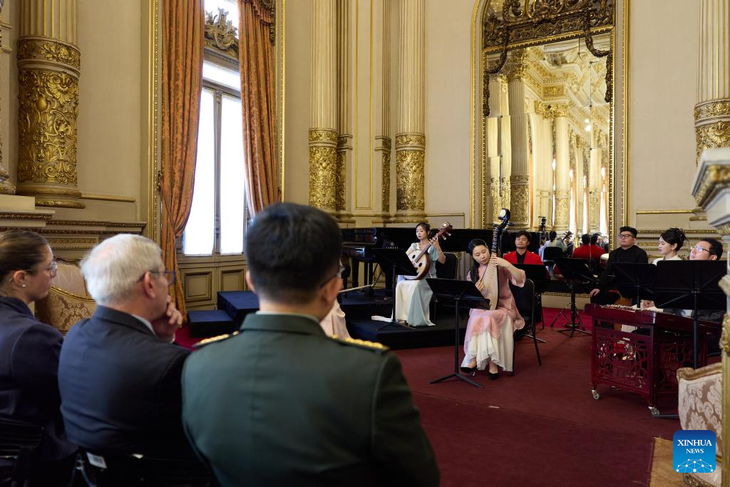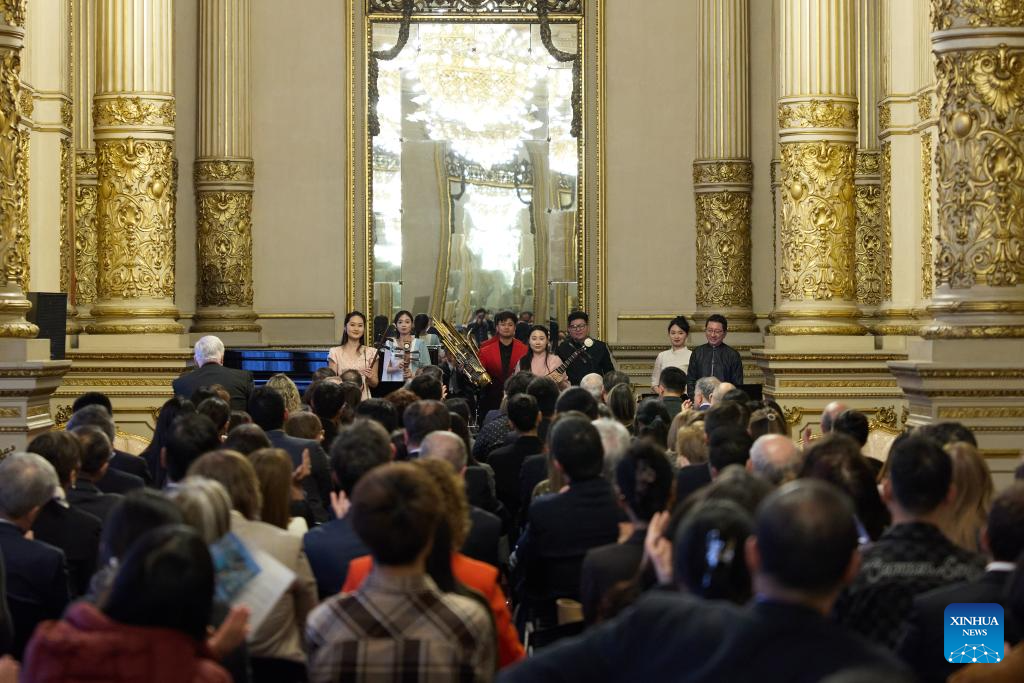 Musicians from China Conservatory of Music perform traditional Chinese pieces during a Chinese folk music concert at the Colon Theater in Buenos Aires, Argentina, Sept. 22, 2025. (Xinhua/Meng Dingbo)