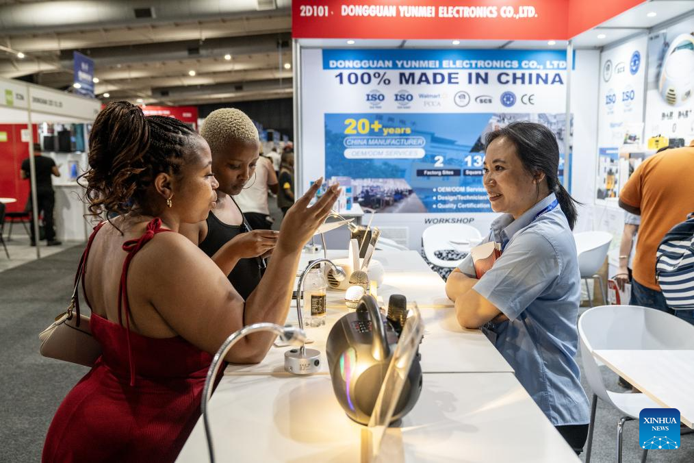 Visitors communicate with an exhibitor (R) at the ninth China-South Africa Trade Fair in Johannesburg, South Africa, Sept. 23, 2025. (Photo by Shiraaz Mohamed/Xinhua)