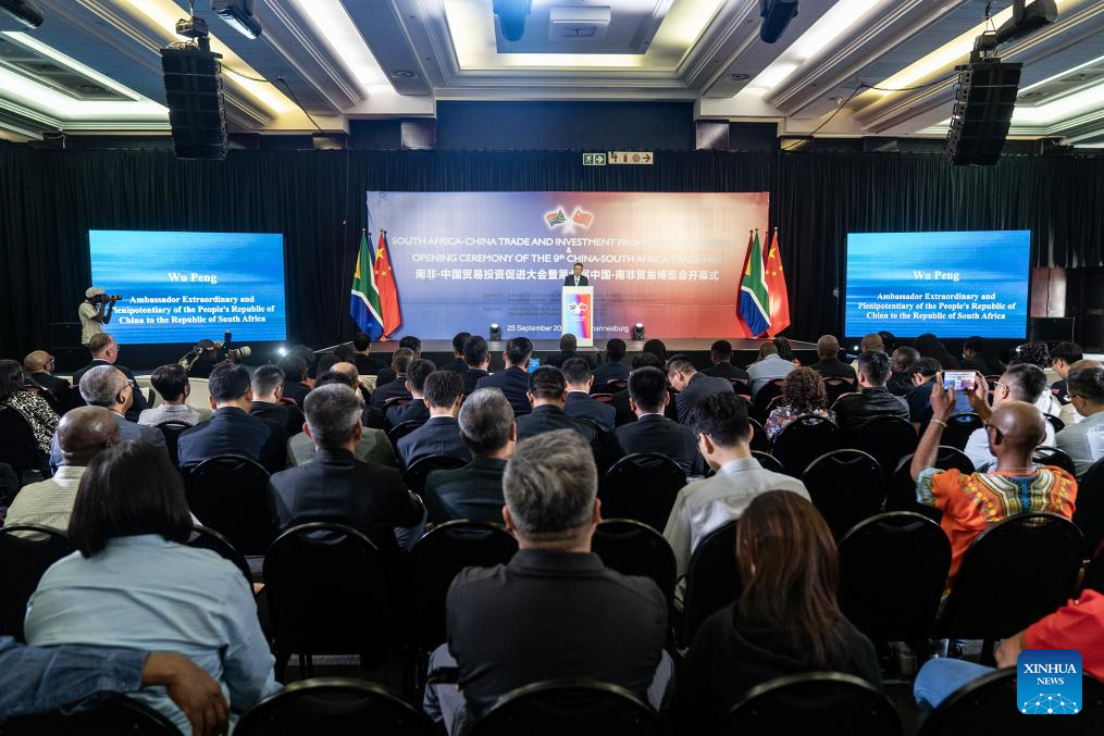 Chinese Ambassador to South Africa Wu Peng addresses the opening ceremony of the South Africa-China Trade and Investment Promotion Conference and the ninth China-South Africa Trade Fair in Johannesburg, South Africa, Sept. 23, 2025. (Photo by Shiraaz Mohamed/Xinhua)