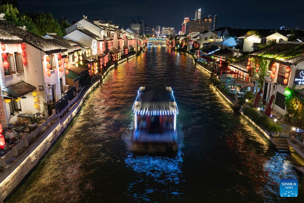 Sightseeing boats sail on the ancient canal in Wuxi City, east China's Jiangsu Province, Sept. 23, 2025. The Qingming bridge historical and cultural community spreads across the ancient canal, and boasts rich heritages. It is attracting an increasing number of visitors as more modern technologies have been adopted for enhanced sensory experiences. (Xinhua/Hu Zhixuan)