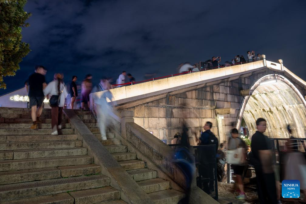 Residents stroll along the ancient canal in Wuxi City, east China's Jiangsu Province, Sept. 23, 2025. The Qingming bridge historical and cultural community spreads across the ancient canal, and boasts rich heritages. It is attracting an increasing number of visitors as more modern technologies have been adopted for enhanced sensory experiences. (Xinhua/Hu Zhixuan)