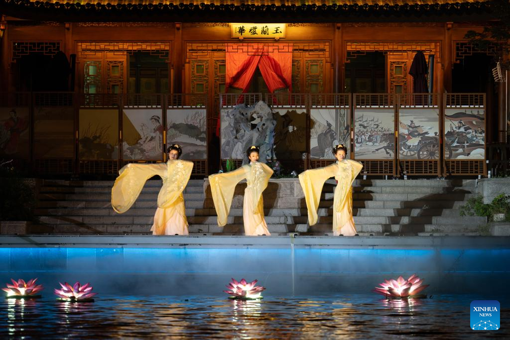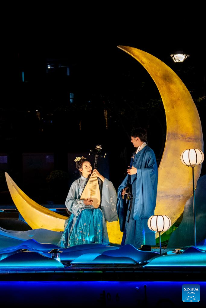 Artists perform along the ancient canal in Wuxi City, east China's Jiangsu Province, Sept. 23, 2025. The Qingming bridge historical and cultural community spreads across the ancient canal, and boasts rich heritages. It is attracting an increasing number of visitors as more modern technologies have been adopted for enhanced sensory experiences. (Xinhua/Hu Zhixuan)