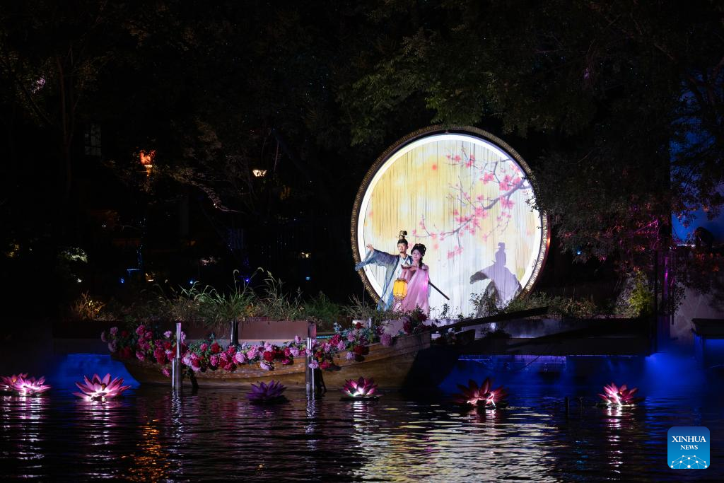 Artists perform on the ancient canal in Wuxi City, east China's Jiangsu Province, Sept. 23, 2025. The Qingming bridge historical and cultural community spreads across the ancient canal, and boasts rich heritages. It is attracting an increasing number of visitors as more modern technologies have been adopted for enhanced sensory experiences. (Xinhua/Hu Zhixuan)