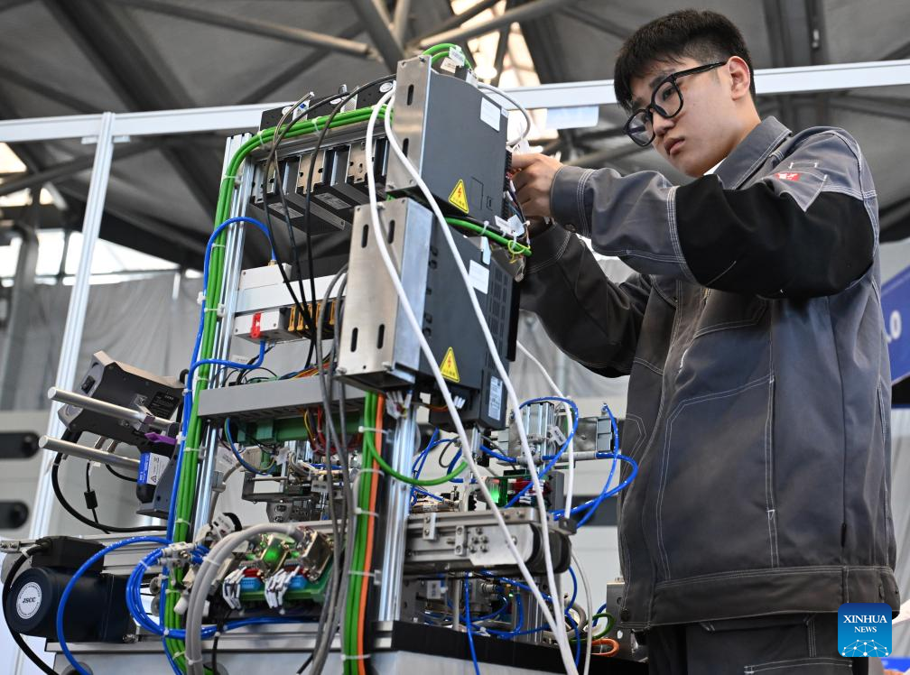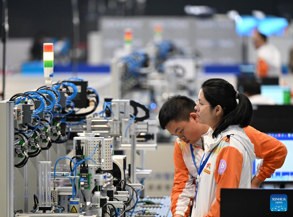 A contestant participates in an industry 4.0 event during the third Vocational Skills Competition in Zhengzhou, central China's Henan Province, Sept. 20, 2025. (Xinhua/Li Jianan)