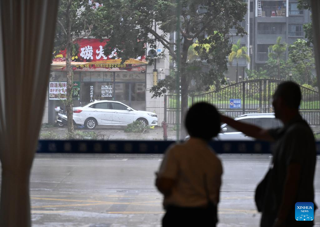 People look out of a window at a hotel in Yangjiang City, south China's Guangdong Province, on Sept. 24, 2025. Typhoon Ragasa, the 18th typhoon of 2025, made landfall in south China's Guangdong Province at about 5 p.m. on Wednesday, according to the provincial meteorological observatory. The typhoon, with maximum wind force near its center reaching 40 meters per second, churned ashore at Hailing Island in the city of Yangjiang in Guangdong. (Xinhua/Deng Hua)