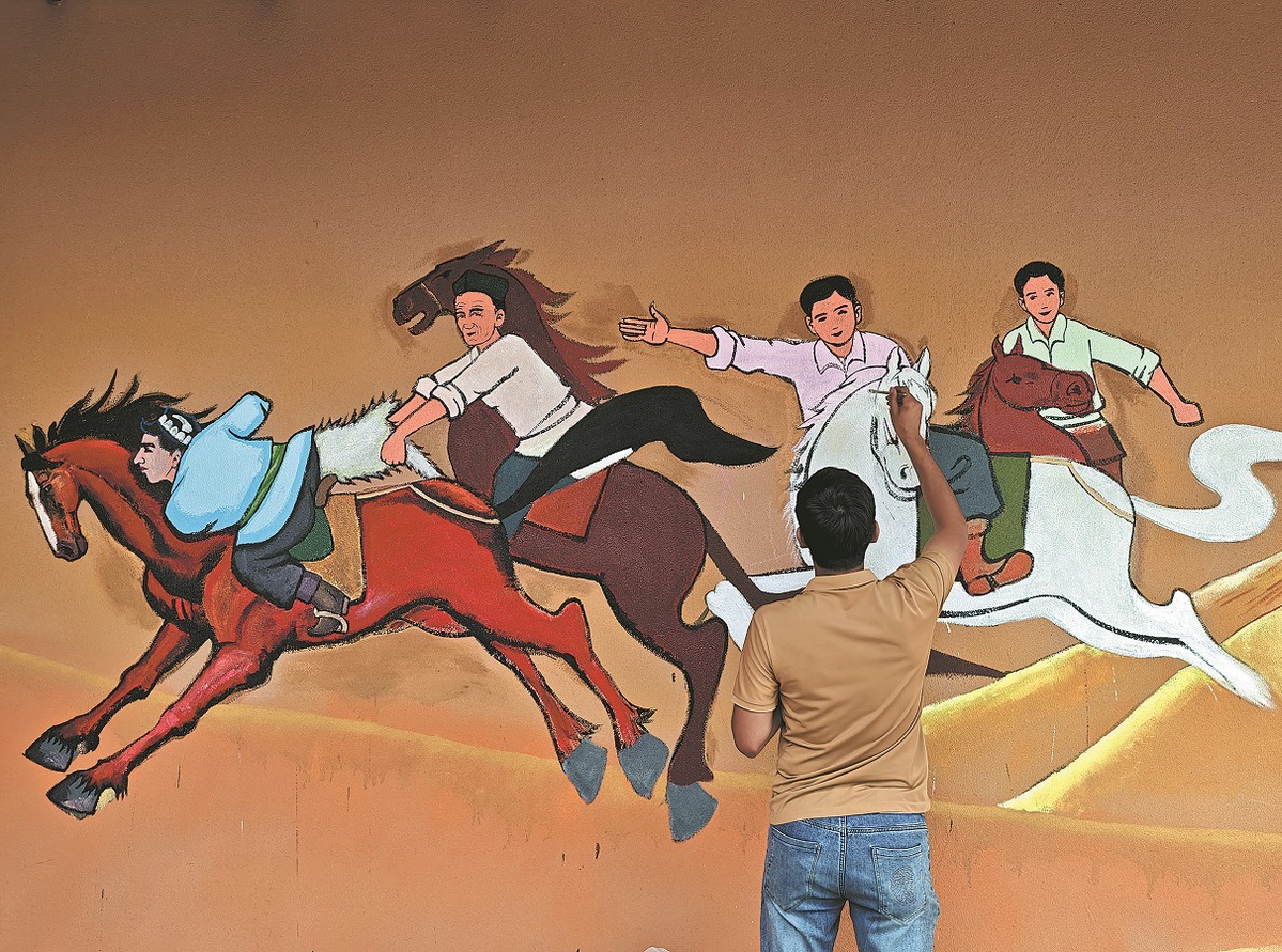 An artist paints on a wall in Awat county on Sept 2. BAO LIANGTING/FOR CHINA DAILY