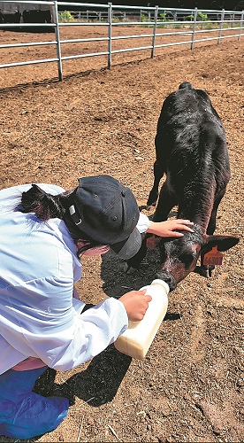 An employee of Tianlai Livestock Group feeds a calf in Bole, Xinjiang Uygur autonomous region. [Photo provided to China Daily]