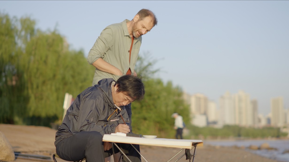 Italian artist Matteo Montani and Chinese artist Chen Mingkun co-create on the banks of the Yellow River. (People's Daily Online/Nika Yan)