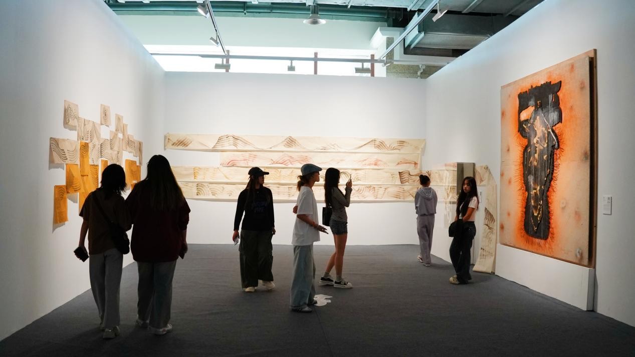The exhibition hall features various works by artists Matteo Montani from Italy, Andrea Nagy from Romania, Michelle Reid from Canada, Kalama Akulez Henri from the Democratic Republic of the Congo, and Chen Mingkun from China. (People's Daily Online/Nika Yan)