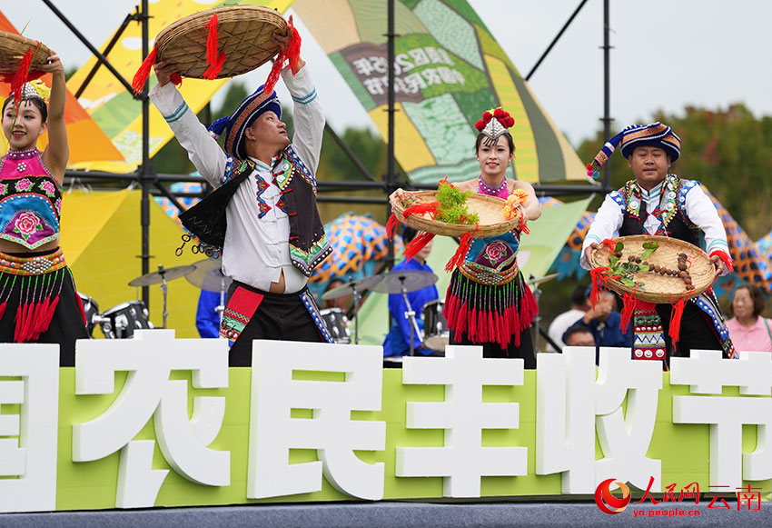 Performers are pictured during a performance at the opening ceremony of an event held to celebrate the eighth Chinese farmers' harvest festival in Jiangwei neighborhood, Chenggong district, Kunming, southwest China's Yunnan Province. (People's Daily Online/Li Faxing)