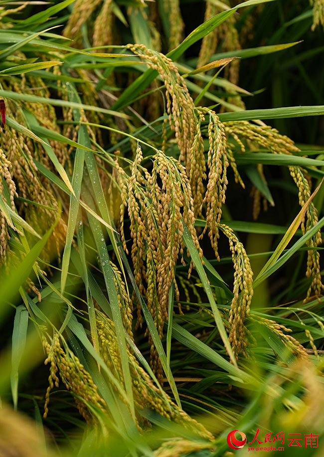 Photo shows rice ears in a paddy field in Jiangwei neighborhood, Chenggong district, Kunming, southwest China's Yunnan Province. (People's Daily Online/Li Faxing)