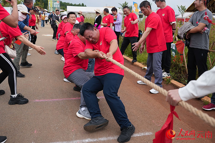 Residents participate in a tug-of-war competition during an event held to celebrate the eighth Chinese farmers' harvest festival in Jiangwei neighborhood, Chenggong district, Kunming, southwest China's Yunnan Province. (People's Daily Online/Li Faxing)