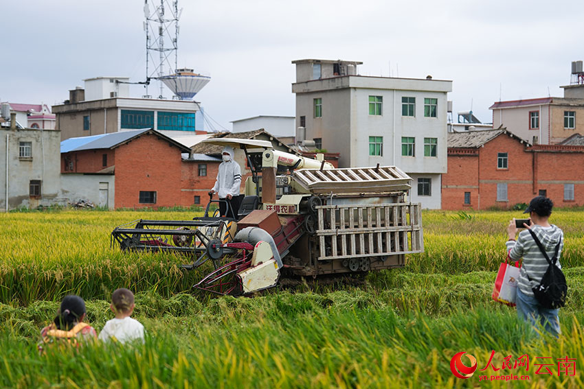 A farm machinery operator harvests rice in Jiangwei neighborhood, Chenggong district, Kunming, southwest China's Yunnan Province. (People's Daily Online/Li Faxing)