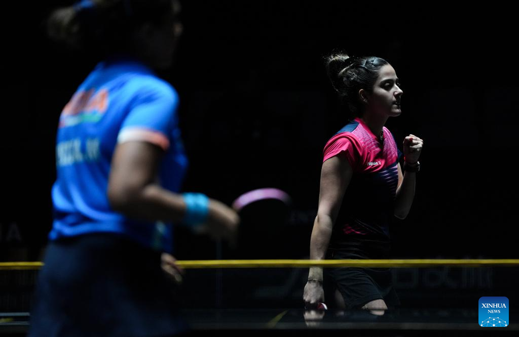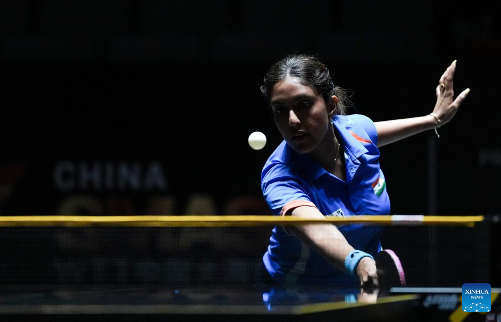 Ayhika Mukherjee hits a return during the women's singles qualifying round 1 match between Daniela Ortega of Chile and Ayhika Mukherjee of India at 2025 World Table Tennis (WTT) China Smash in Beijing, China, Sept. 25, 2025. (Xinhua/Sun Fei)