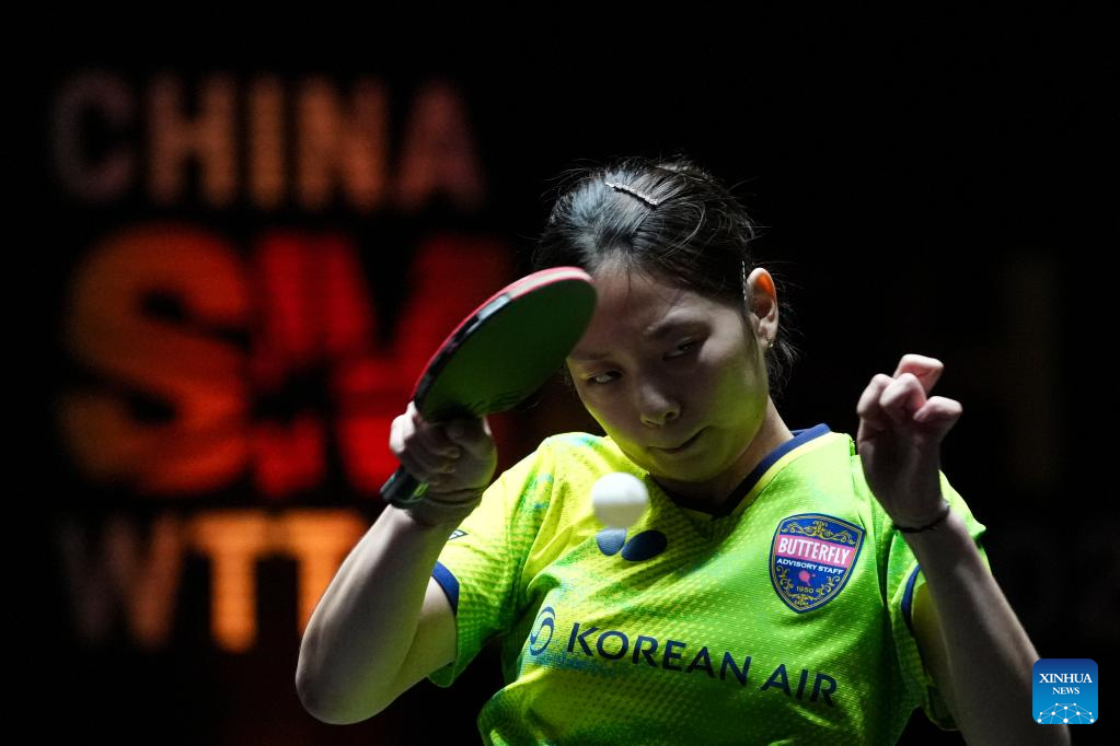 Park Gahyeon hits a return during the women's singles qualifying round 1 match between Park Gahyeon of South Korea and Izabela Lupulesku of Serbia at 2025 World Table Tennis (WTT) China Smash in Beijing, China, Sept. 25, 2025. (Xinhua/Sun Fei)