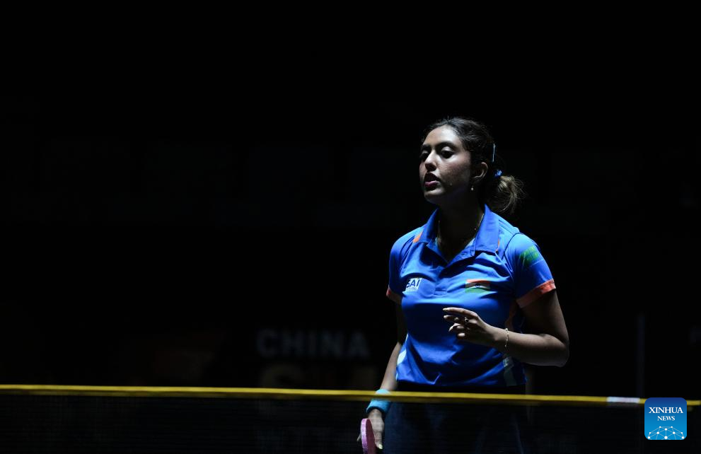 Ayhika Mukherjee reacts during the women's singles qualifying round 1 match between Daniela Ortega of Chile and Ayhika Mukherjee of India at 2025 World Table Tennis (WTT) China Smash in Beijing, China, Sept. 25, 2025. (Xinhua/Sun Fei)