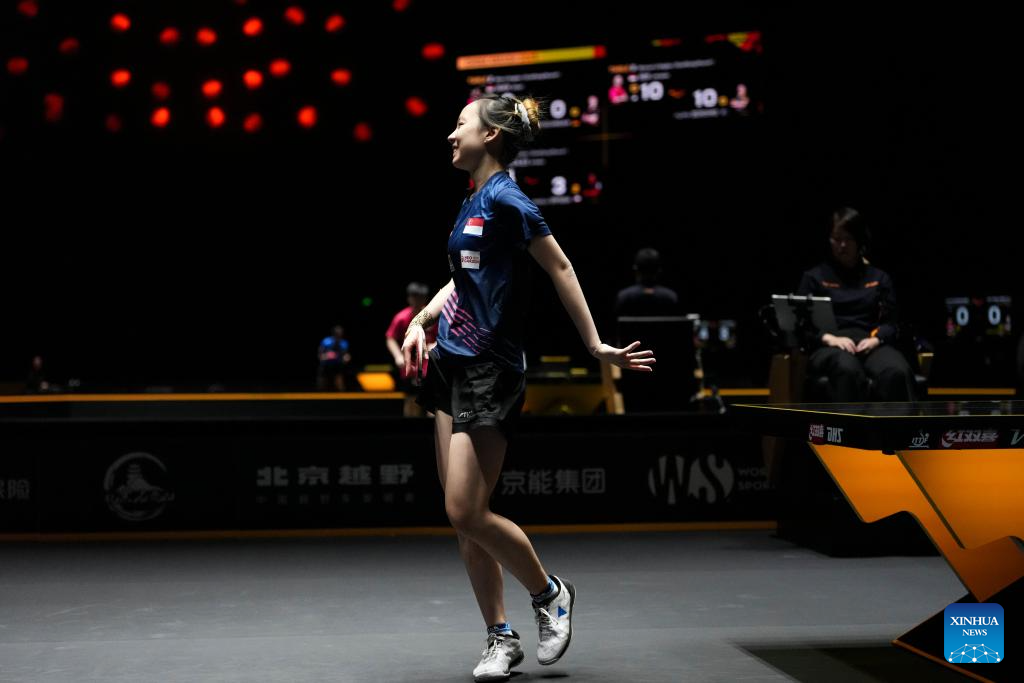 Ser Lin Qian reacts during the women's singles qualifying round 1 match between Ser Lin Qian of Singapore and Filippa Bergand of Sweden at 2025 World Table Tennis (WTT) China Smash in Beijing, China, Sept. 25, 2025. (Xinhua/Sun Fei)