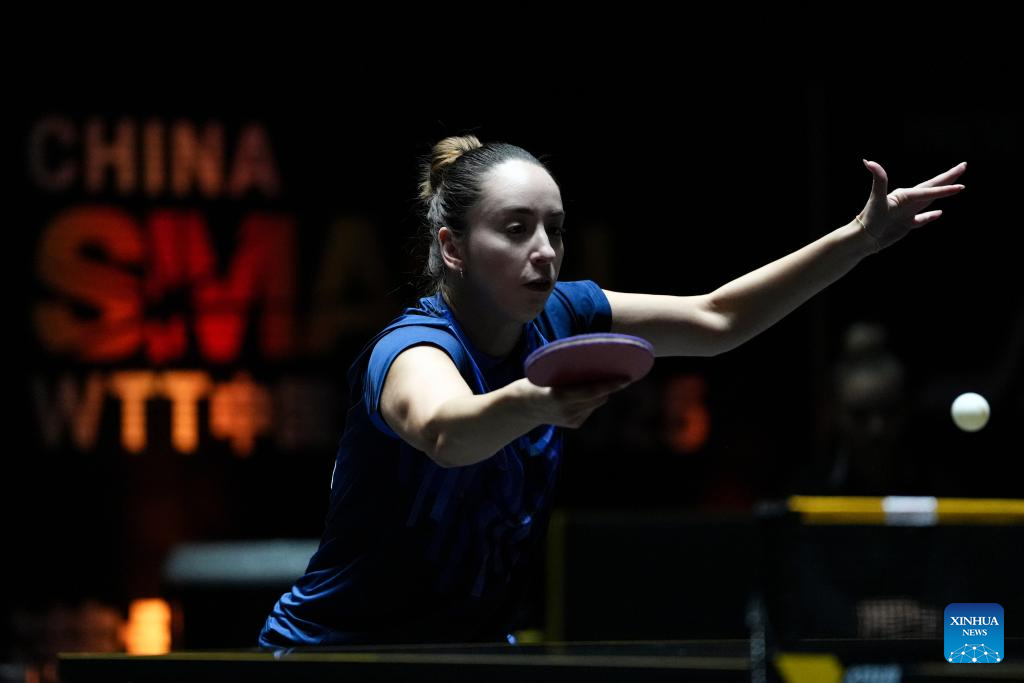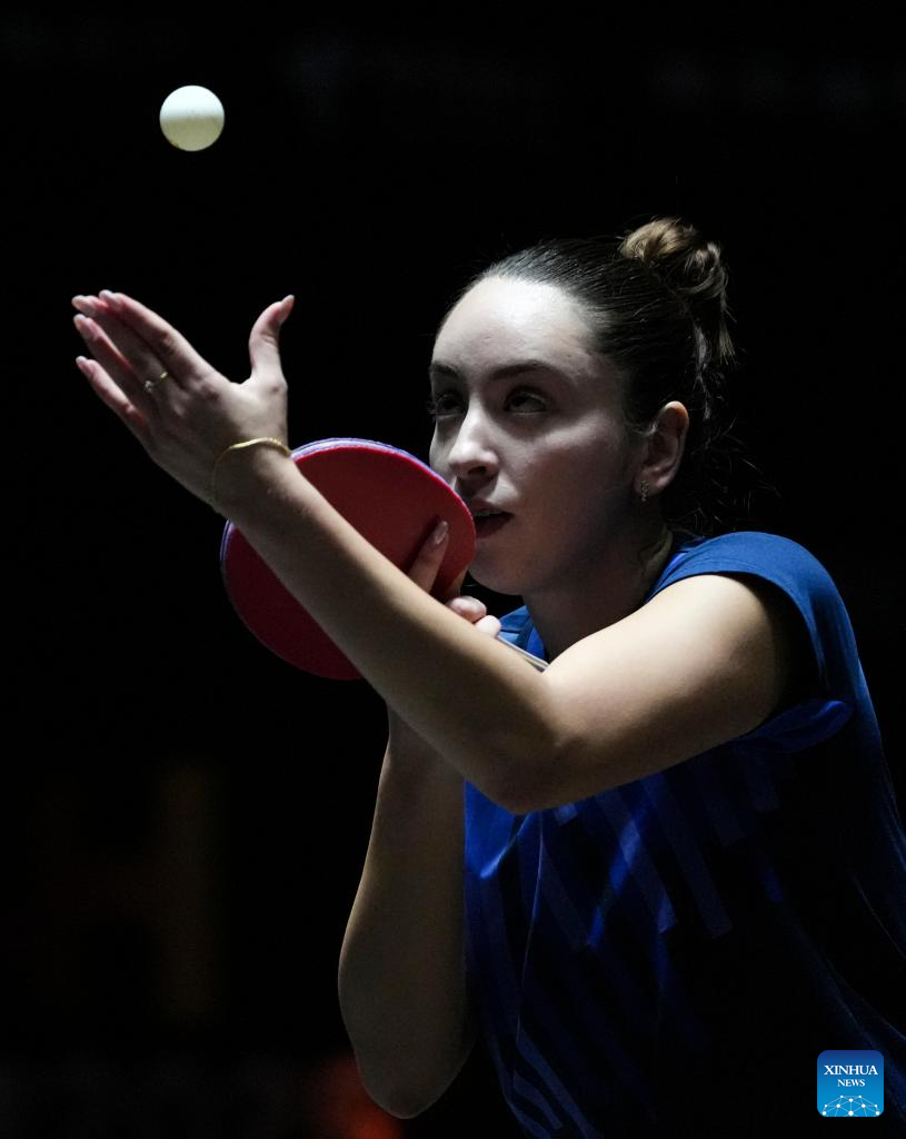 Izabela Lupulesku hits a return during the women's singles qualifying round 1 match between Park Gahyeon of South Korea and Izabela Lupulesku of Serbia at 2025 World Table Tennis (WTT) China Smash in Beijing, China, Sept. 25, 2025. (Xinhua/Sun Fei)