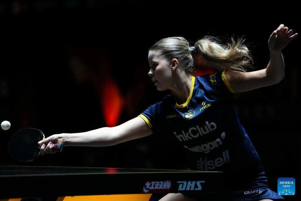 Filippa Bergand serves during the women's singles qualifying round 1 match between Ser Lin Qian of Singapore and Filippa Bergand of Sweden at 2025 World Table Tennis (WTT) China Smash in Beijing, China, Sept. 25, 2025. (Xinhua/Sun Fei)