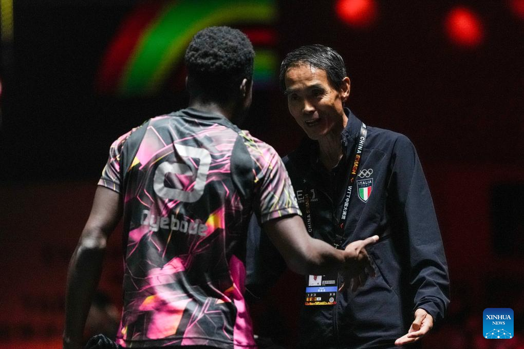 John Oyebode (L) communicates with coach Jiang Zilong during the men's singles qualifying round 1 match between Andreas Levenko of Austria and John Oyebode of Italy at 2025 World Table Tennis (WTT) China Smash in Beijing, China, Sept. 25, 2025. (Xinhua/Sun Fei)