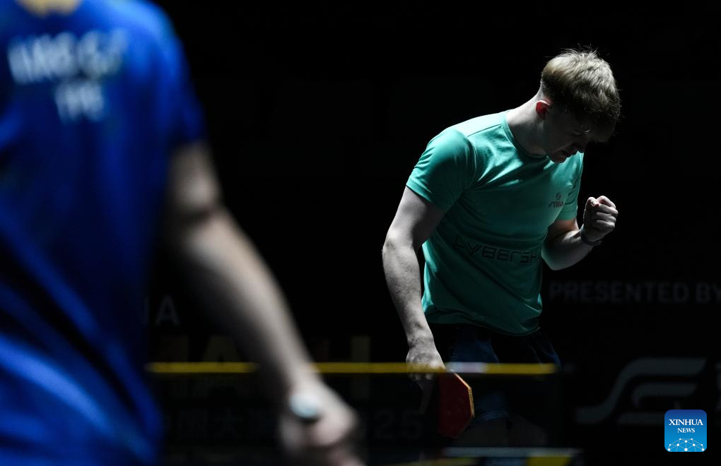 Tom Jarvis celebrates during the men's singles qualifying round 1 match between Tom Jarvis of England and Liao Cheng-Ting of Chinese Taipei at 2025 World Table Tennis (WTT) China Smash in Beijing, China, Sept. 25, 2025. (Xinhua/Sun Fei)