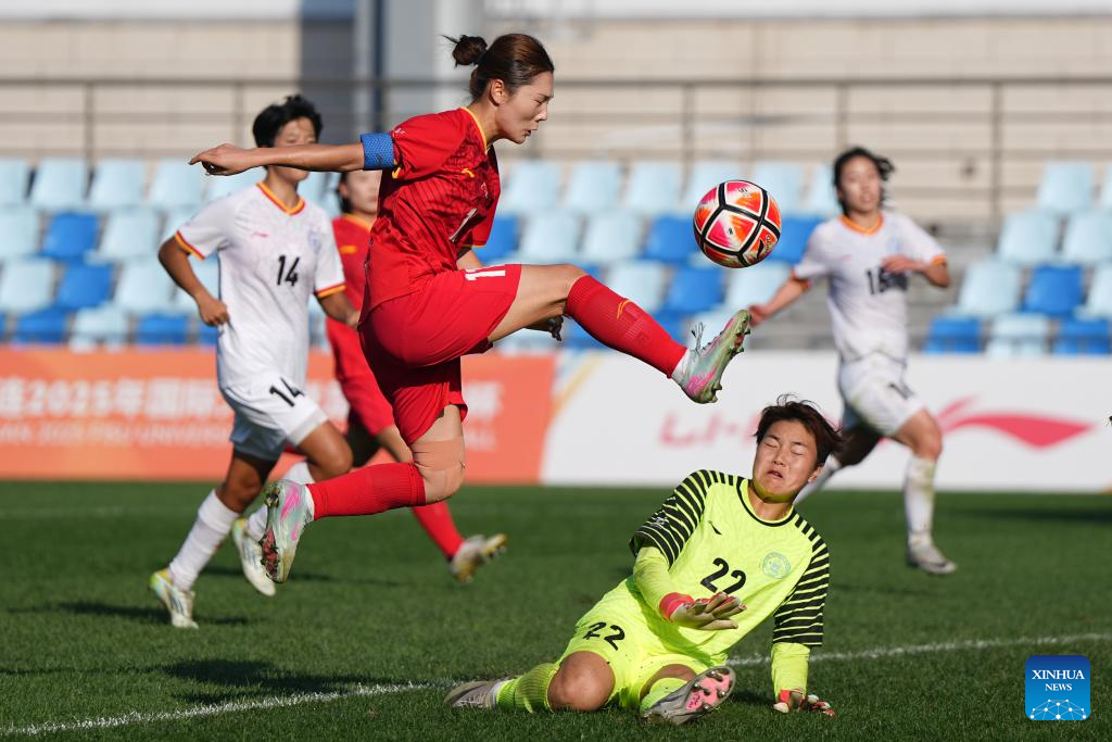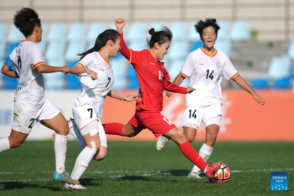Liu Xuan (2nd R) of Shanghai University of Sport shoots during the women's semifinal match between Shanghai University of Sport (CHN) and Beijing Normal University (CHN) at 2025 FISU University World Cup Football in Dalian, northeast China's Liaoning Province, Sept. 25, 2025. (Xinhua/Zheng Huansong)