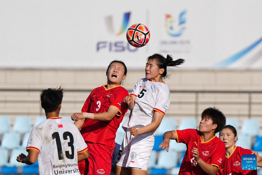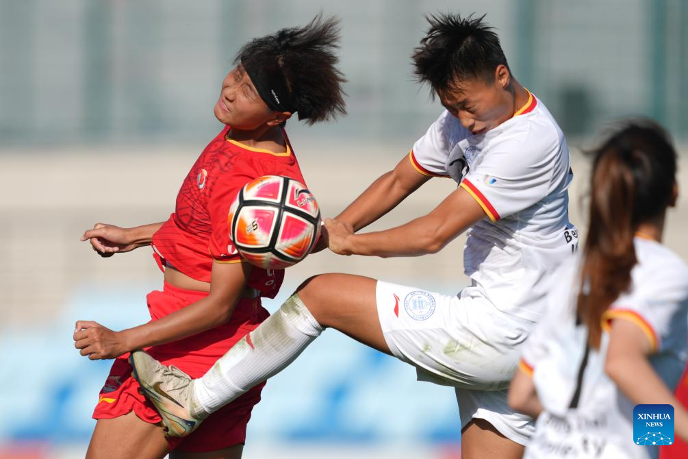Zheng Jiayu (top L) of Shanghai University of Sport vies with Lu Jiayu (top R) of Beijing Normal University during the women's semifinal match between Shanghai University of Sport (CHN) and Beijing Normal University (CHN) at 2025 FISU University World Cup Football in Dalian, northeast China's Liaoning Province, Sept. 25, 2025. (Xinhua/Zheng Huansong)