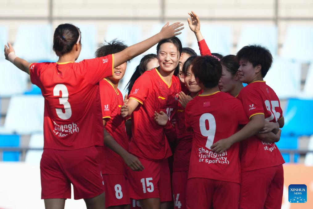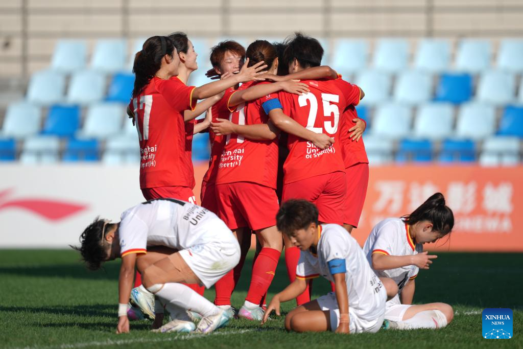 Players of Shanghai University of Sport celebrate scoring during the women's semifinal match between Shanghai University of Sport (CHN) and Beijing Normal University (CHN) at 2025 FISU University World Cup Football in Dalian, northeast China's Liaoning Province, Sept. 25, 2025. (Xinhua/Zheng Huansong)
