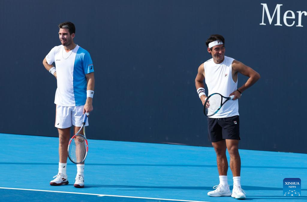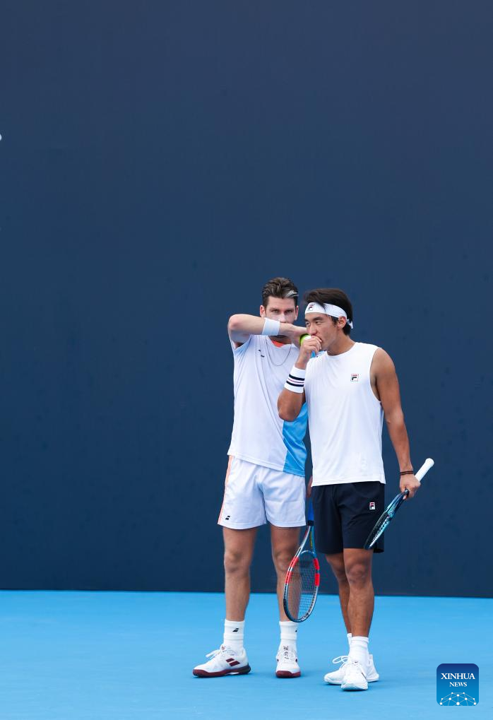 Bu Yunchaokete (L)/Cameron Norrie (front) compete during the men's doubles first round match between Bu Yunchaokete (China)/Cameron Norrie (Britain) and Marcelo Melo (Brazil)/Alexander Zverev (Germany) at 2025 China Open tennis tournament in Beijing, China, Sept. 25, 2025. (Photo by Ma Zihan/Xinhua)