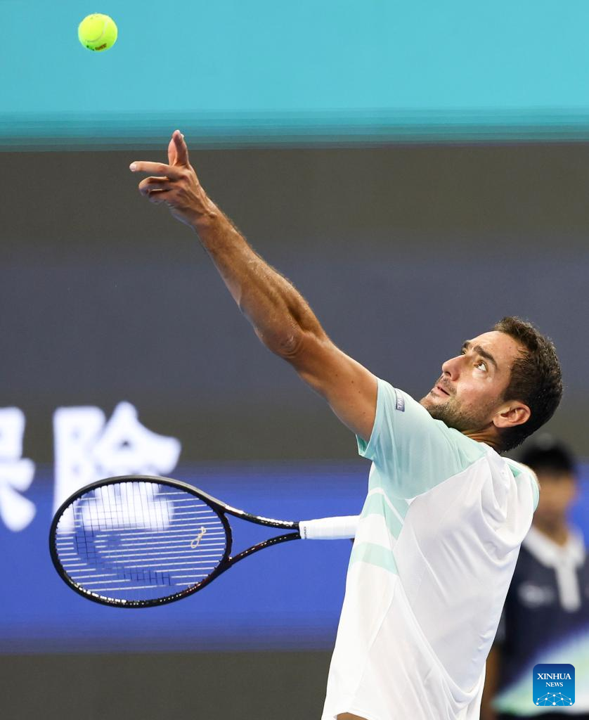 Marin Cilic serves during the men's singles first round match between Jannik Sinner of Italy and Marin Cilic of Croatia at 2025 China Open tennis tournament in Beijing, China, Sept. 25, 2025. (Xinhua/Du Xinyi)