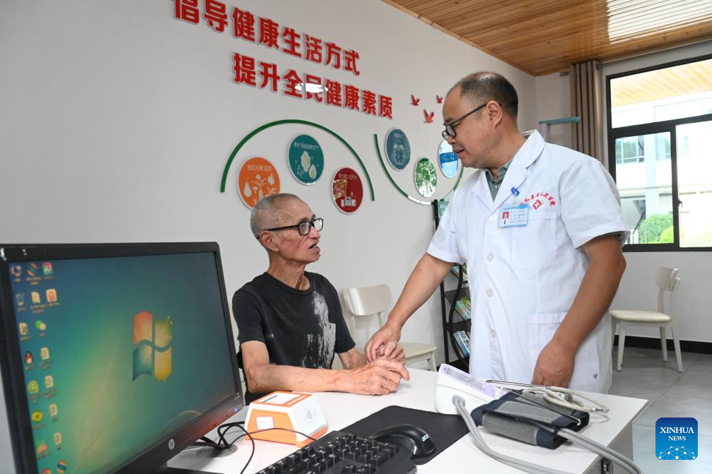 A doctor conducts health check for a patient at a community elderly care center in Shitun Town of Zhenghe County, Nanping City, southeast China's Fujian Province, Sept. 24, 2025. Zhenghe County in Fujian Province has been actively building a comprehensive elderly care system, exploring the construction of community elderly care centers in villages and towns, which are transformed from idle primary schools, old nursing homes and other idle resources and have promoted elderly care in remote rural areas. (Xinhua/Lin Shanchuan)