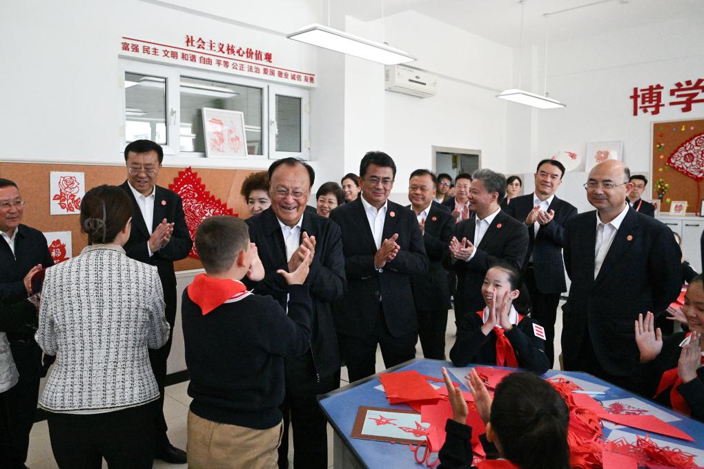 Shohrat Zakir and members of a central delegation visit a primary school in Urumqi, northwest China's Xinjiang Uygur Autonomous Region, Sept. 25, 2025. Entrusted by Xi Jinping, general secretary of the Communist Party of China Central Committee, members of a central delegation on Thursday visited local officials and residents in multiple areas of northwest China's Xinjiang Uygur Autonomous Region. (Xinhua/Xin Yuewei)