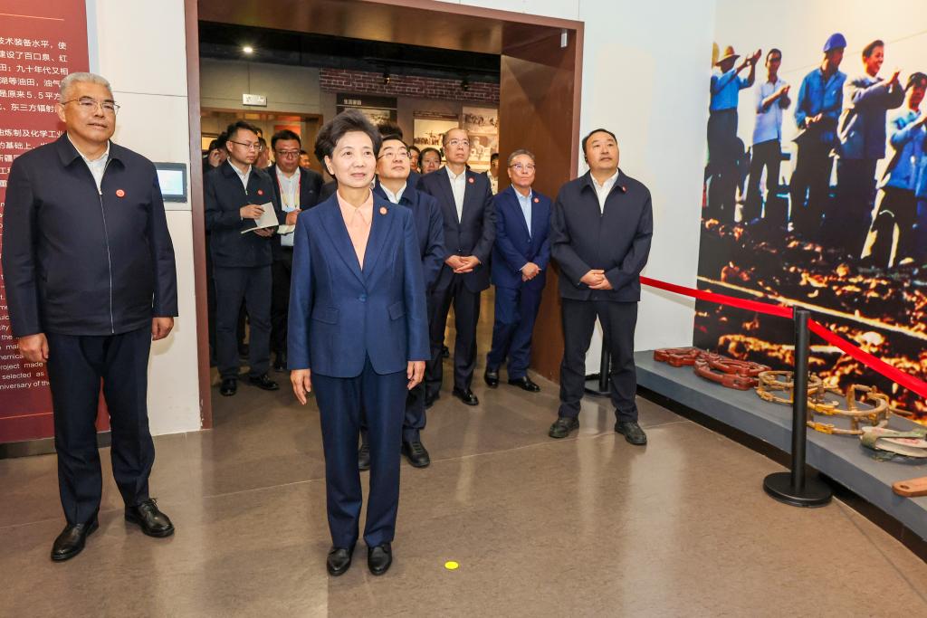 Shen Yiqin and members of a central delegation visit a museum in Karamay, northwest China's Xinjiang Uygur Autonomous Region, Sept. 25, 2025. Entrusted by Xi Jinping, general secretary of the Communist Party of China Central Committee, members of a central delegation on Thursday visited local officials and residents in multiple areas of northwest China's Xinjiang Uygur Autonomous Region. (Xinhua/Jiang Fan)