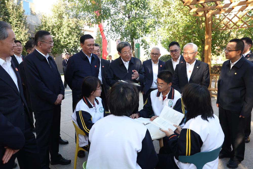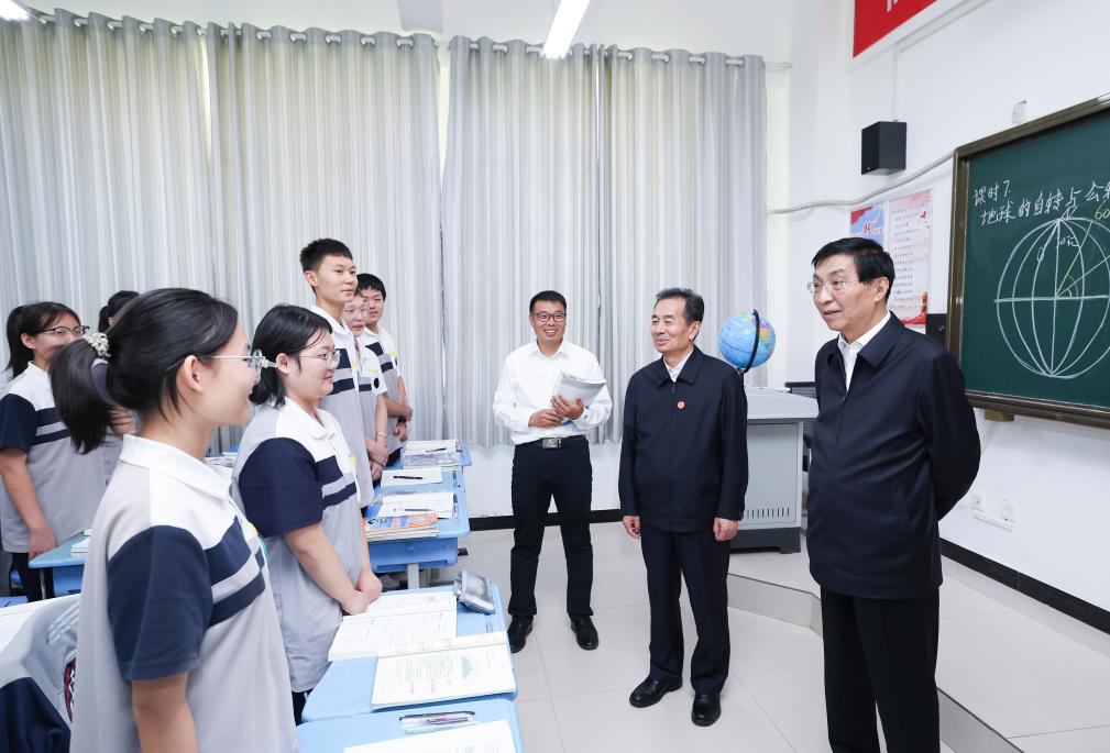 Wang Huning, a member of the Standing Committee of the Political Bureau of the Communist Party of China (CPC) Central Committee, chairman of the National Committee of the Chinese People's Political Consultative Conference and head of a central delegation, and members of the delegation learn about education assistance to Xinjiang at a middle school in Korla City, northwest China's Xinjiang Uygur Autonomous Region, Sept. 25, 2025. Entrusted by Xi Jinping, general secretary of the CPC Central Committee, Wang led a group of the delegation members to the city of Korla and visited local officials and residents on Thursday. (Xinhua/Yao Dawei)
