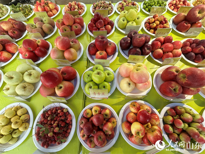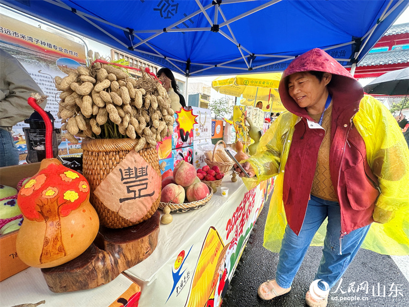 Various fruits and vegetables entice visitors at a fair during the main event of the eighth Chinese farmers' harvest festival in Zhaoyuan, east China's Shandong Province. (People's Daily Online/Qiao Shu)