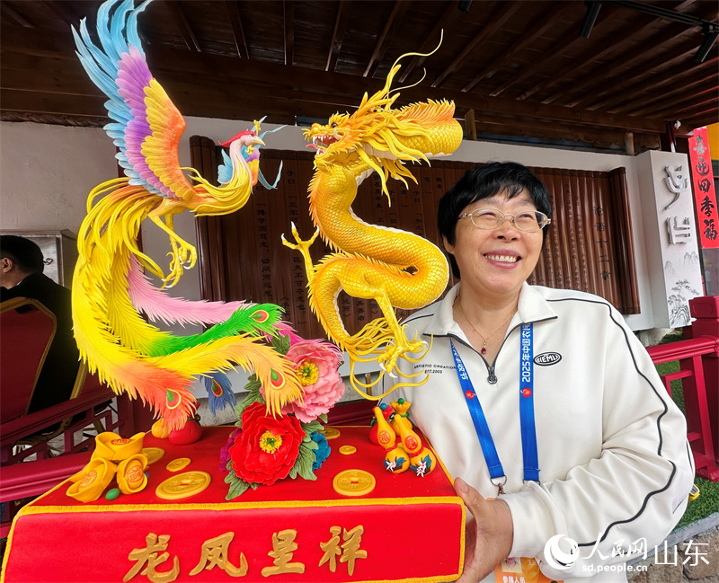 An artisan showcases dough figurines at a fair during the main event of the eighth Chinese farmers' harvest festival in Zhaoyuan, east China's Shandong Province. (People's Daily Online/Qiao Shu)