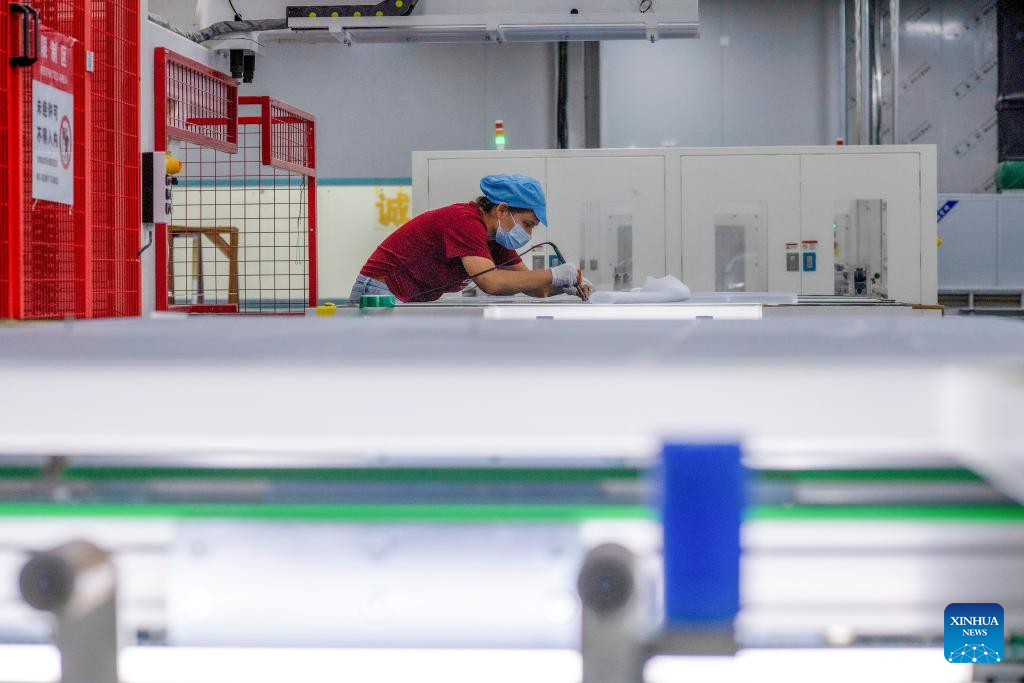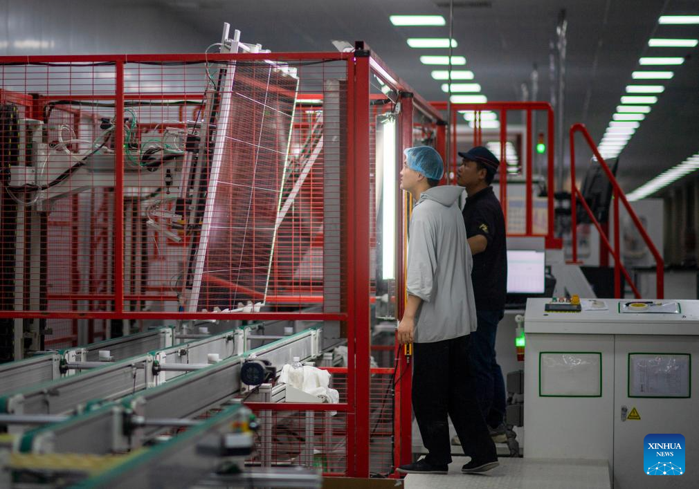 Staff members work on the production line of photovoltaic panels at the workshop of a new energy company in Ruoqiang County, Mongolian Autonomous Prefecture of Bayingolin, northwest China's Xinjiang Uygur Autonomous Region, Sept. 22, 2025. (Xinhua/Jiang Wenyao)