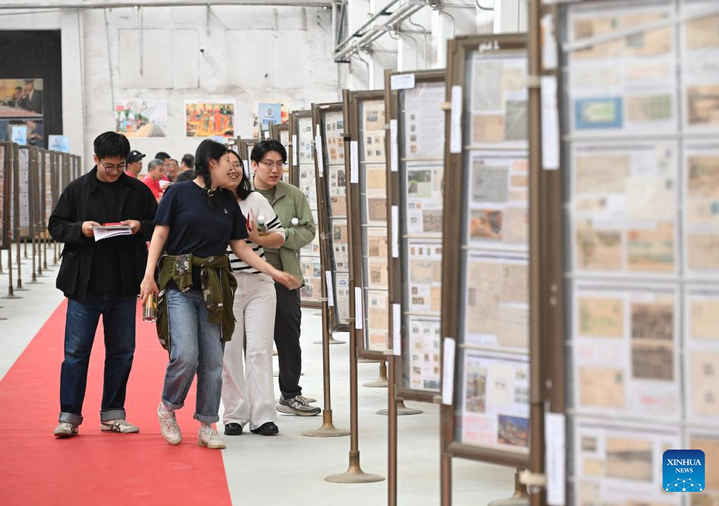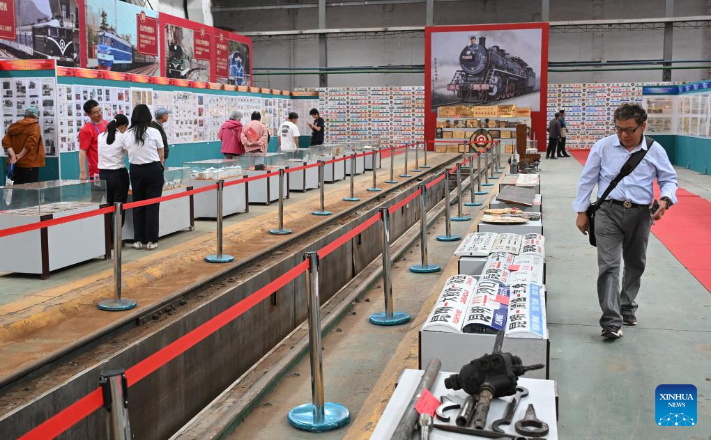 People visit a railway old objects exhibition during an expo themed on Chinese railway culture in Beijing, capital of China, Sept. 27, 2025. An expo displaying collections of items on Chinese railway culture kicked off here on Saturday, showcasing the development and achievement of Chinese railway. (Xinhua/Li He)