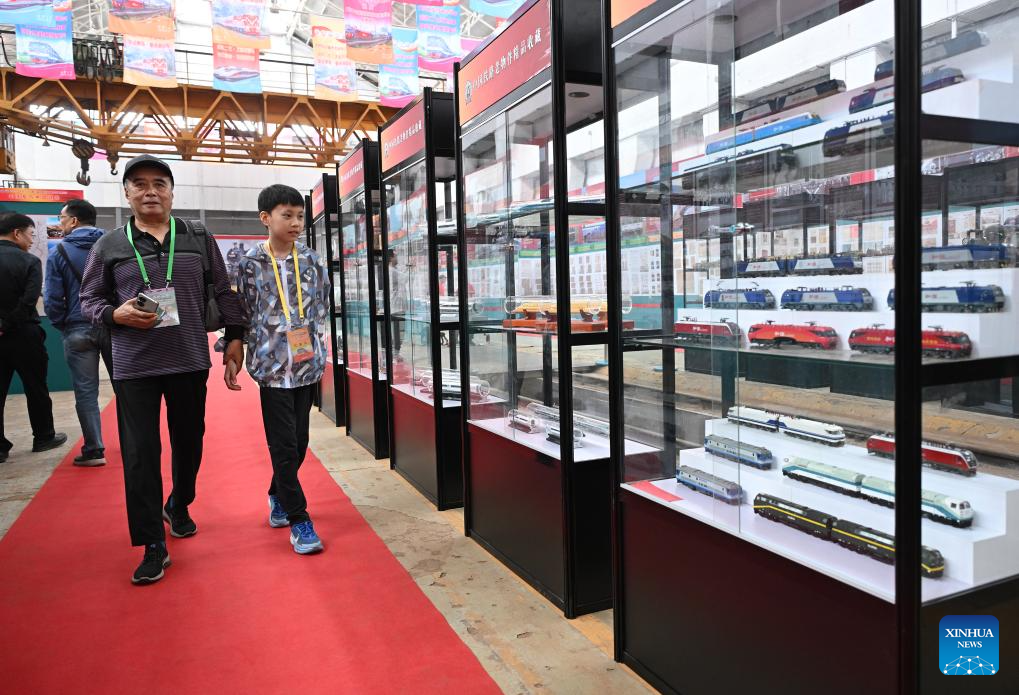 People view locomotive models during an expo themed on Chinese railway culture in Beijing, capital of China, Sept. 27, 2025. An expo displaying collections of items on Chinese railway culture kicked off here on Saturday, showcasing the development and achievement of Chinese railway. (Xinhua/Li He)