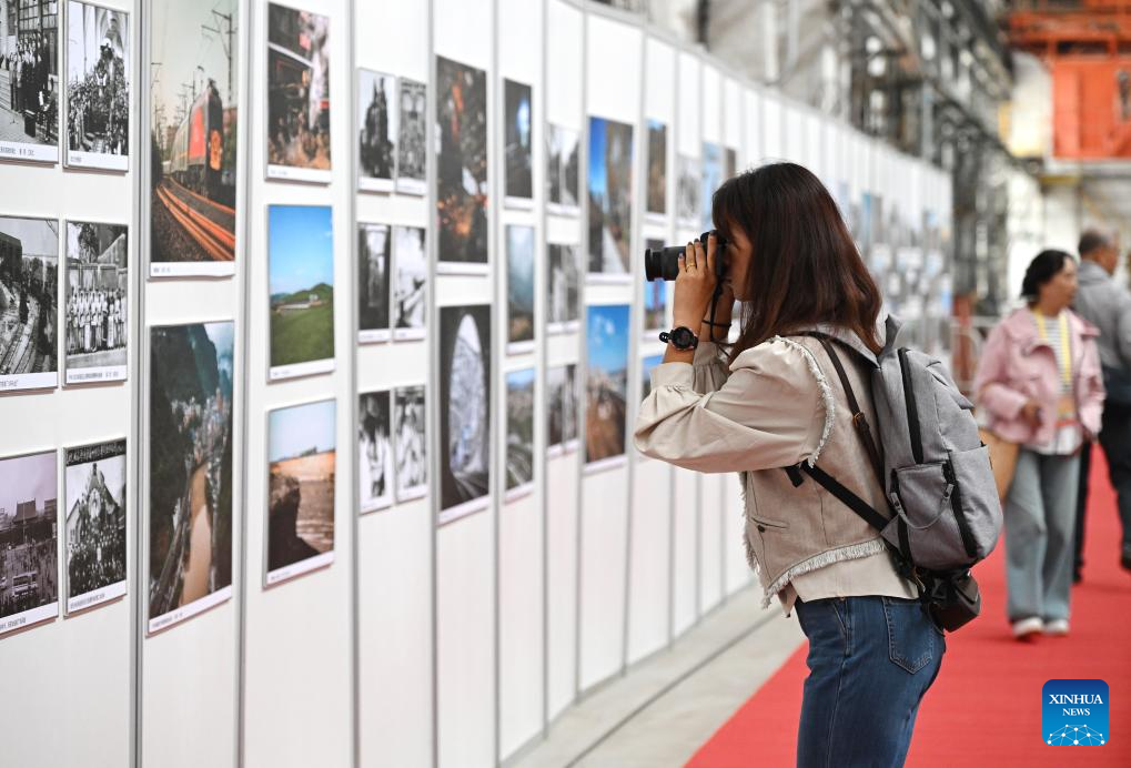 A visitor takes a photo at a railway photo exhibition during an expo themed on Chinese railway culture in Beijing, capital of China, Sept. 27, 2025. An expo displaying collections of items on Chinese railway culture kicked off here on Saturday, showcasing the development and achievement of Chinese railway. (Xinhua/Li He)