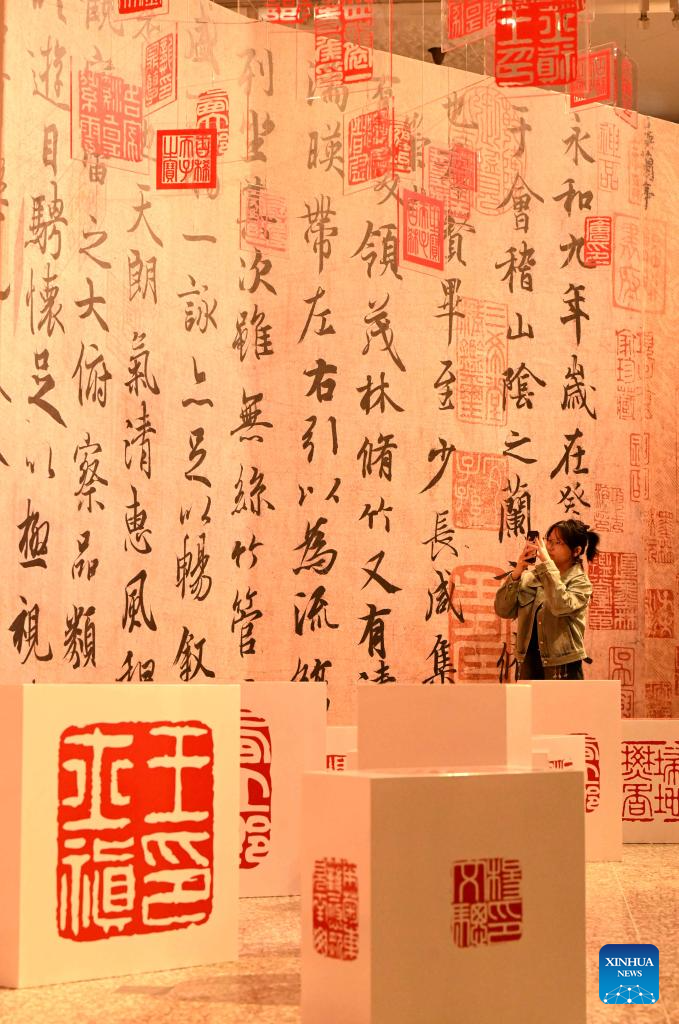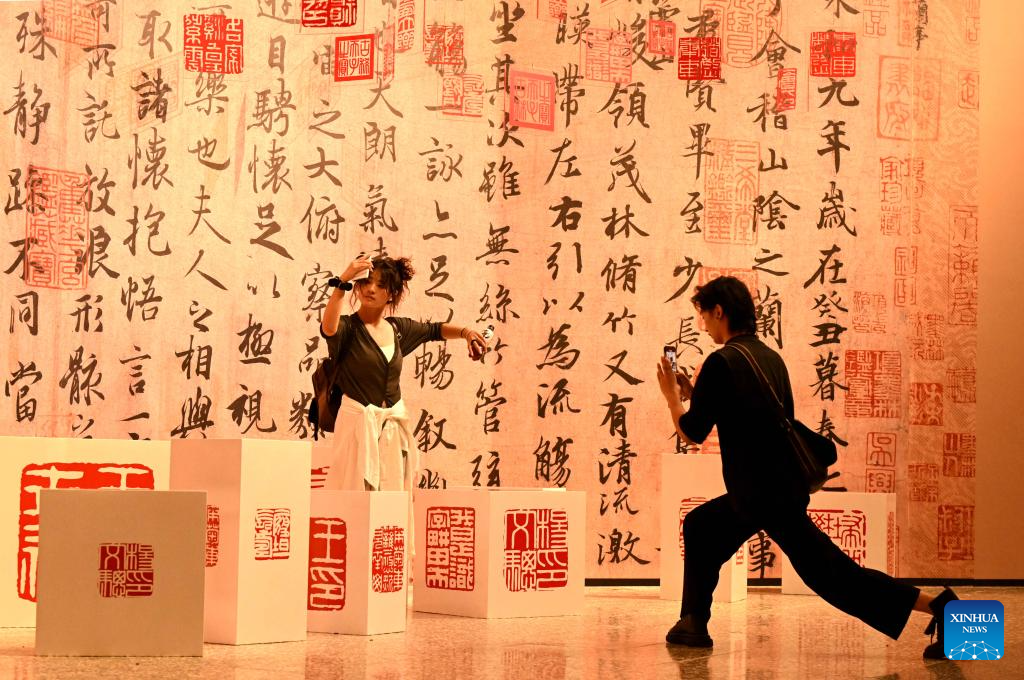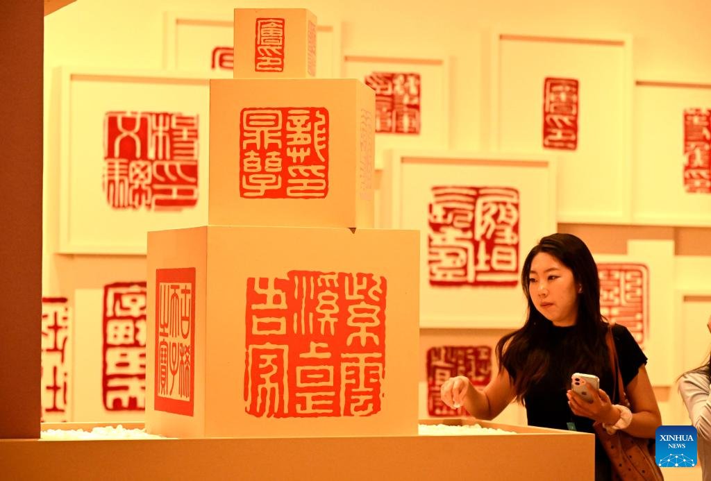A visitor takes a photo during an exhibition themed on ancient Chinese seals at Hebei Museum in Shijiazhuang City, north China's Hebei Province, Sept. 27, 2025. The exhibition kicked off here on Saturday and will last until December 25. (Photo by Chen Qibao/Xinhua)