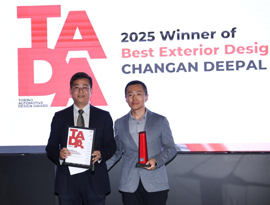 Representatives of Changan Deepal S07 receive the Best Exterior Design award of the Turin Automotive Design Award (TADA) during the 2025 Turin Auto Show in Turin, Italy, Sept. 26, 2025. (Xinhua/Li Jing)