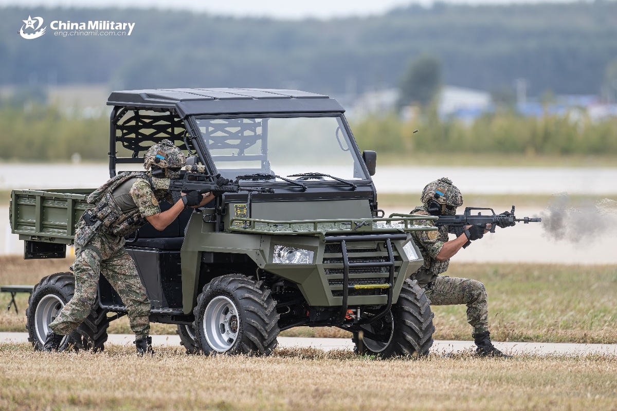 Special operations soldiers assigned to the airborne troops under the Chinese PLA Air Force march forward in a counter-terrorism operating demonstration during the 2025 aviation open-day activities of the Chinese PLA Air Force and Changchun Air Show in Changchun City, northeast China's Jilin Province. (eng.chinamil.com.cn/Photo by Chen Gongyu)