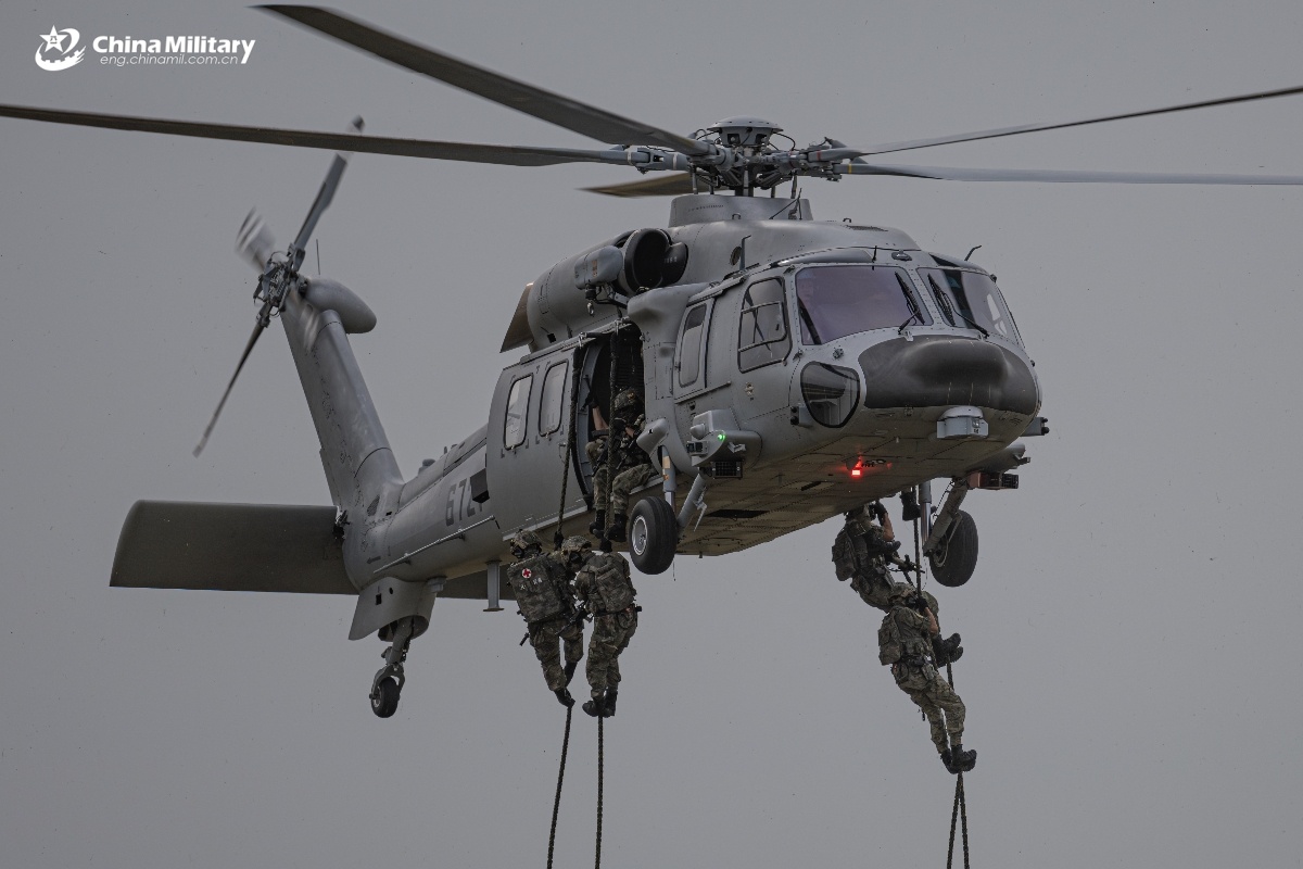 Special operations soldiers assigned to the airborne troops under the Chinese PLA Air Force fast rope from a Z-20 utility helicopter in a counter-terrorism operating demonstration during the 2025 aviation open-day activities of the Chinese PLA Air Force and Changchun Air Show in Changchun City, northeast China's Jilin Province. (eng.chinamil.com.cn/Photo by Chen Gongyu)