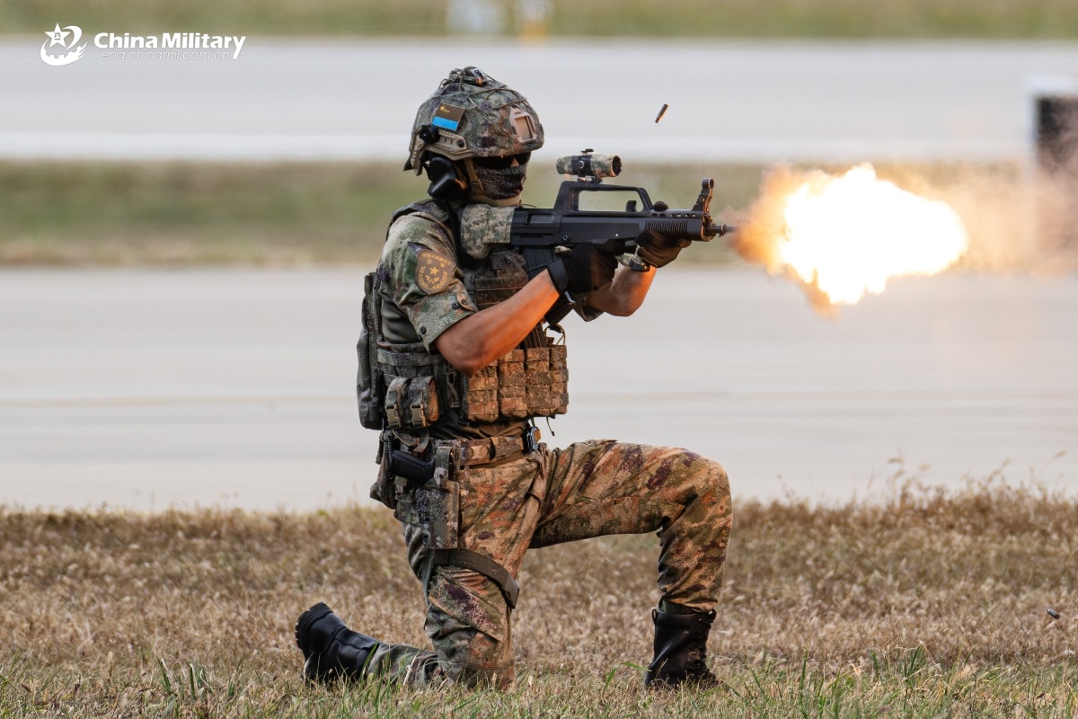 A special operations soldier assigned to the airborne troops under the Chinese PLA Air Force fires at the target in a counter-terrorism operating demonstration during the 2025 aviation open-day activities of the Chinese PLA Air Force and Changchun Air Show in Changchun City, northeast China's Jilin Province. (eng.chinamil.com.cn/Photo by Chen Gongyu)
