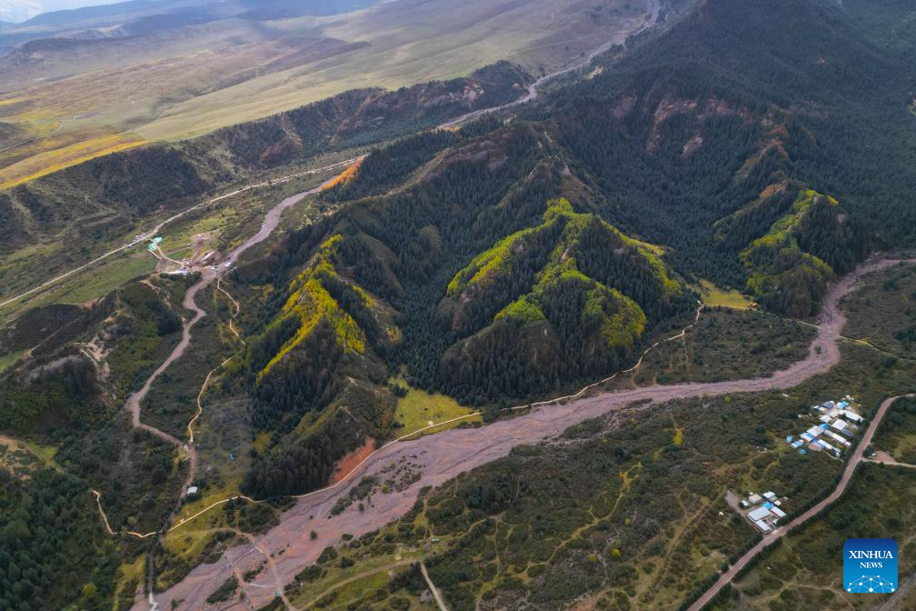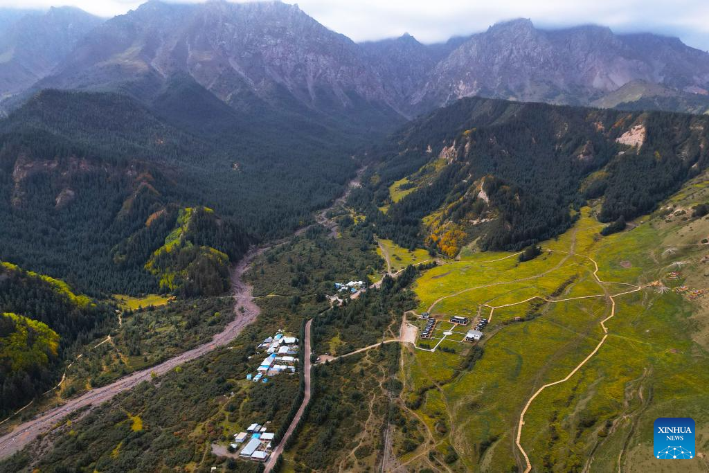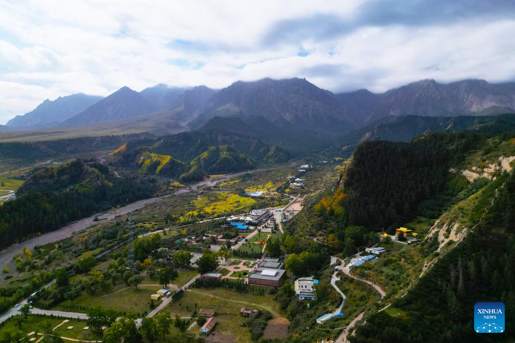 An aerial drone photo taken on Sept. 26, 2025 shows the autumn view around the Mati Temple Grottoes in Zhangye City, northwest China's Gansu Province. First built around 1,600 years ago along the route of the ancient Silk Road, the Mati Temple Grottoes are famous for Buddhist relics preserved in more than 70 caves, including more than 500 colored sculptures as well as murals spanning a total of over 1,200 sq meters. (Xinhua/Zhang Zhimin)