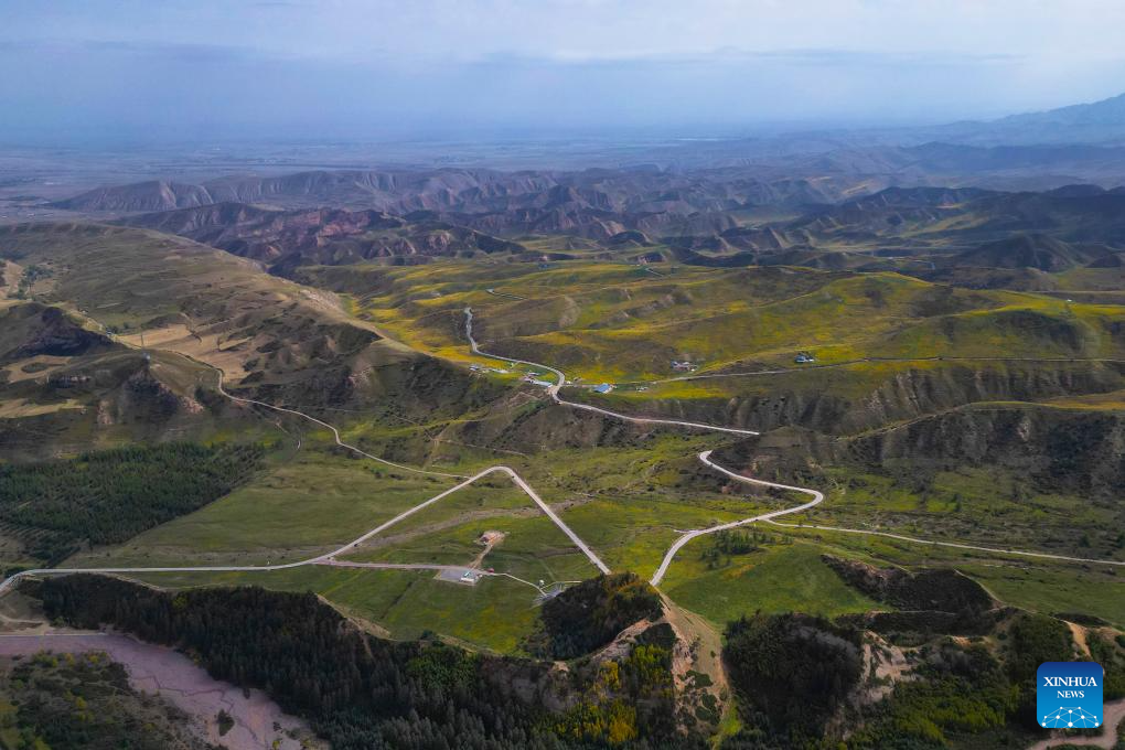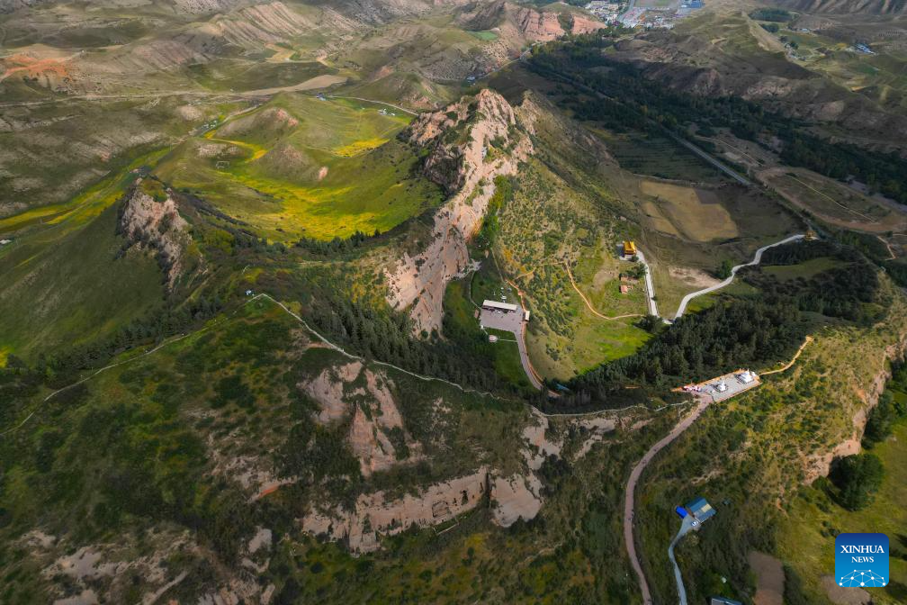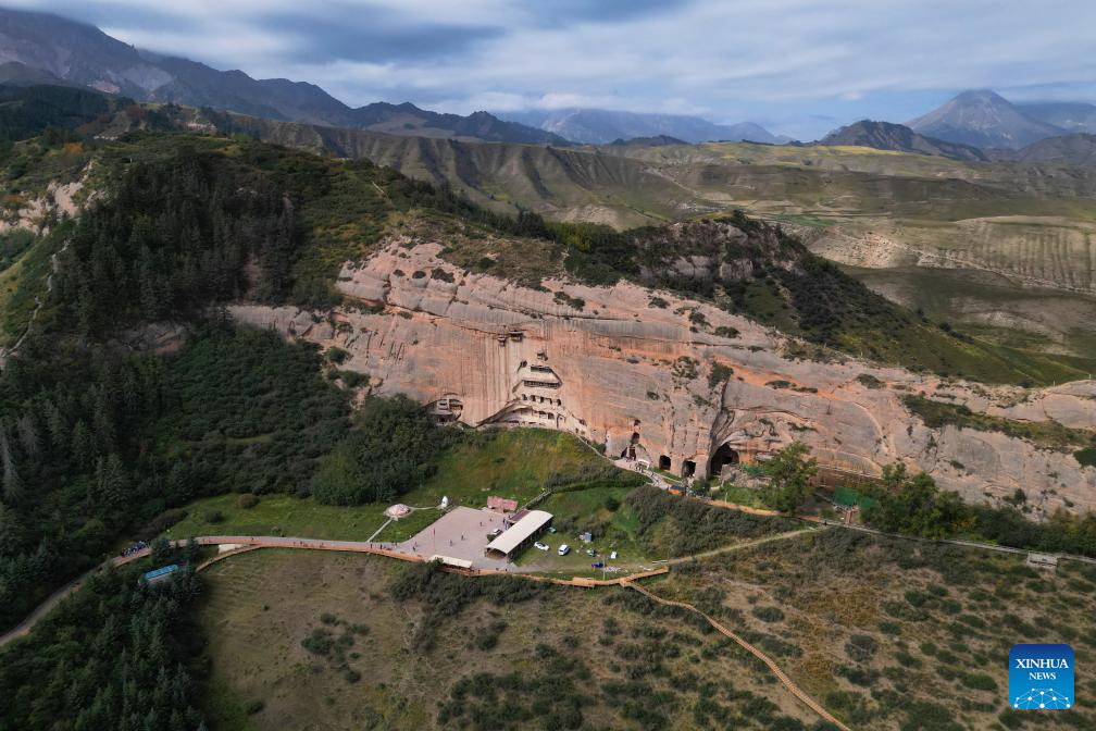 An aerial drone photo taken on Sept. 26, 2025 shows a view of the Mati Temple Grottoes in Zhangye City, northwest China's Gansu Province. First built around 1,600 years ago along the route of the ancient Silk Road, the Mati Temple Grottoes are famous for Buddhist relics preserved in more than 70 caves, including more than 500 colored sculptures as well as murals spanning a total of over 1,200 sq meters. (Xinhua/Zhang Zhimin)