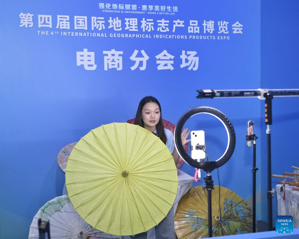 A staff member promotes oil-paper umbrellas via livestreaming during the 4th International Geographical Indications Products Expo in Luzhou, southwest China's Sichuan Province, Sept. 26, 2025. The event kicked off here on Friday. (Xinhua/Liu Kun)