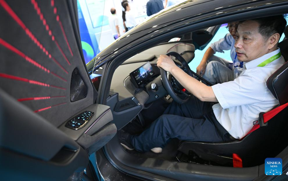 Visitors view an autonomous-driving car for rental service during the 2025 World New Energy Vehicle Congress (WNEVC 2025) in Haikou, south China's Hainan Province, Sept. 27, 2025. The 3-day congress kicked off here on Saturday, featuring series of activities such as conferences and seminars, technology exhibitions, and technology evaluations. (Xinhua/Guo Cheng)