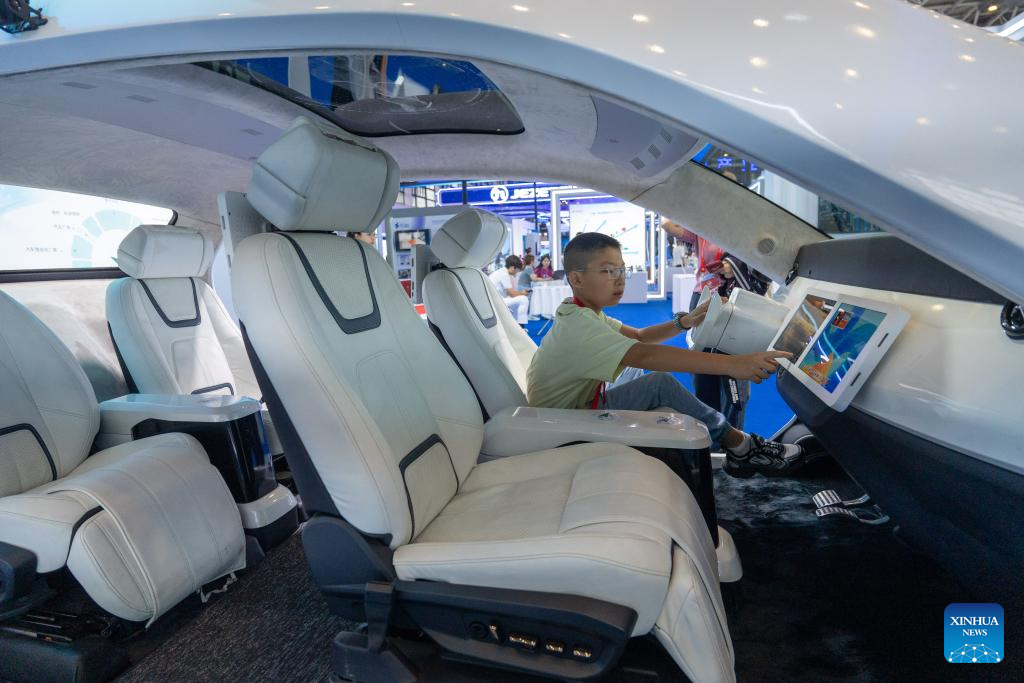 A boy learns about a future-concept vehicle during the 13th China (Mianyang) Science and Technology City International High-Tech Expo in Mianyang, southwest China's Sichuan Province, Sept. 27, 2025. The expo opened here on Friday and will last until Sept. 30, with a core exhibition area of 32,000 square meters for science and technology which focuses on electronic manufacturing technology, new display technology, AI technology and low-altitude economy. (Xinhua/Xue Chen)